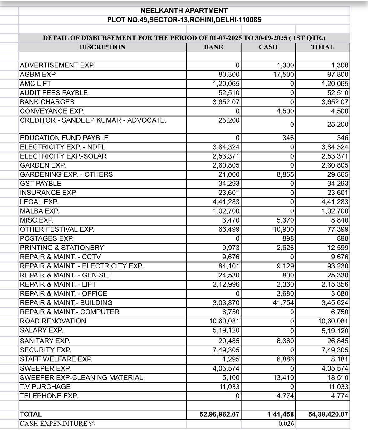 Details of expenditure of society are available at the society office. Any member may access these during the working hours of the society office. Society office is open from 9 AM to 5:30 PM. Thursday is weekly holiday.